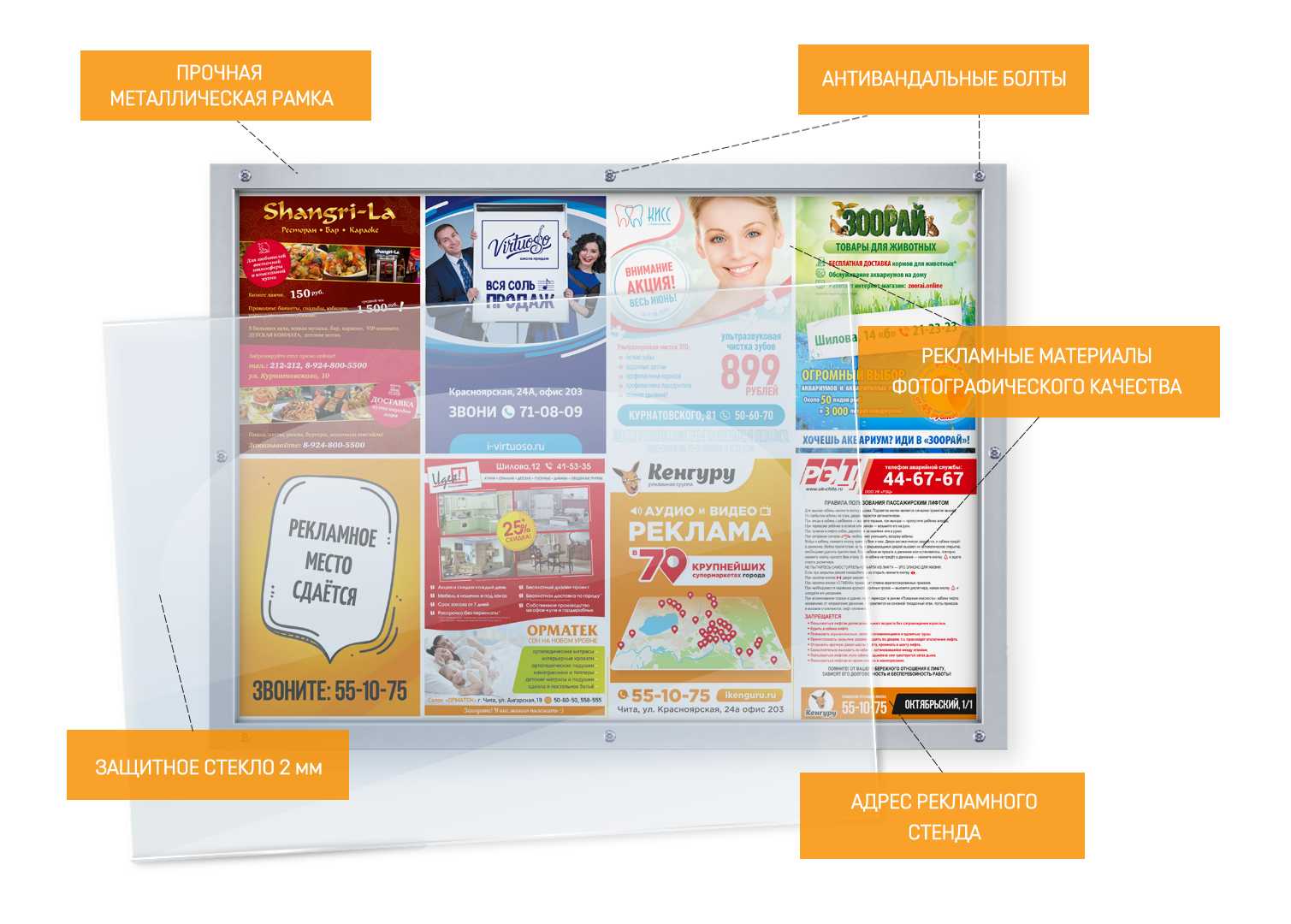 Рекламный стенд оснащен антивандальным